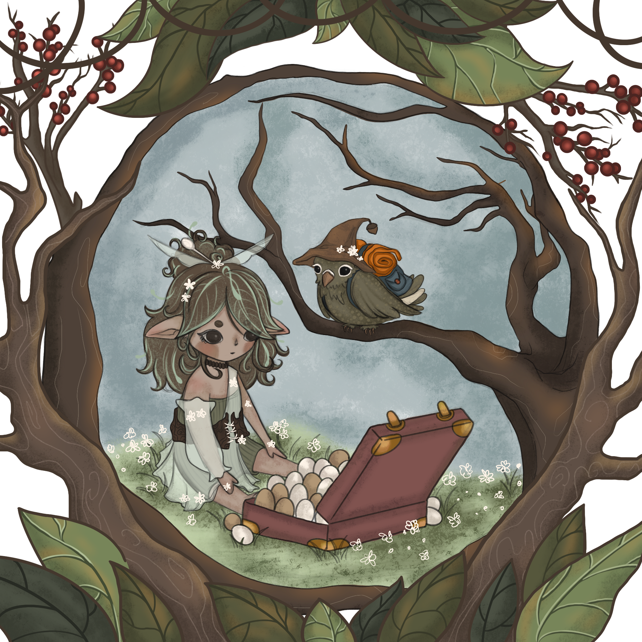 long ago, the planet was rich with extravagant, abundant forests full of a rich diversity of mushrooms, moss, ferns, vines and flowers of all varieties. of these, the greatest of all was the ‘aionios’ forest. a small, secluded village was situated deep within the foliage at it's center, and was inhabited solely by thirteen elves. each elf was gifted with a unique, special ability, that they used to help the village thrive and progress. the village leader was rhya, who could talk to animals, particularly the birds, which were crucial to the village for the warning of impending storms, potential predators, and even village communication. his daughter, capidgeccino, had a vast knowledge of botany from a young age and used her ability to craft medicine for the elves. life was peaceful, content and harmonious; until that fateful day.